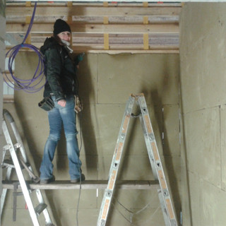 Nun begannen wir die Trennwände für Zimmer und Bäder zu errichten, verschraubten die Platten, unternahmen die ersten Putzversuche. Nun, die 3 Tonnen Lehmfeinputz trage ich ganz fein einzeln in Eimer abgefüllt nach und nach hoch. Dann geht`s... Wenn Schubi mich dabei "erwischt", lässt er sofort alles fallen und trägt mir die schweren Eimer hoch, dabei meckert er dann immer so schön. Das geht noch besser - für mich.
